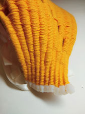 從向日葵中誕生出溫暖與秩序兩個詞,毛線的質感與顏色表現出溫暖,編織手法體現出秩序,在設計中發現了束帶的可塑性,把原本綑綁固定的束帶作為帽子的骨架,有機的取線意外符合了所需,再運用緞帶來調節鬆緊,用新穎的材料是這次設計中的特色,最後繩線的效果也是貼合了向陽的主題。